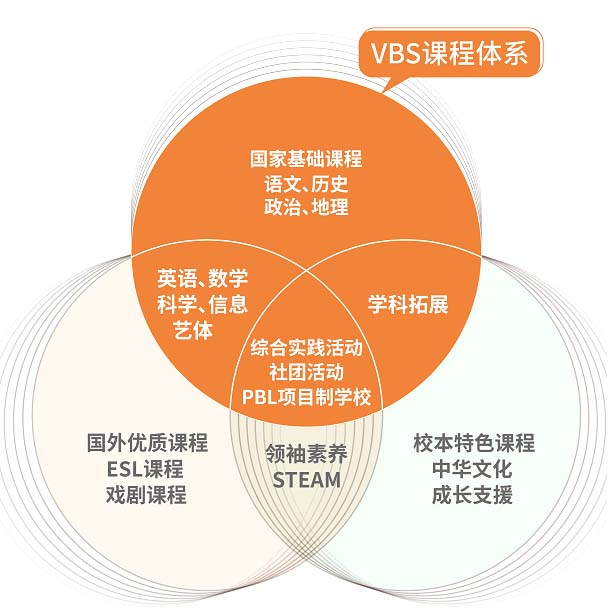 国家必修课程、中外融合课程为“VBS课程”系列一“源动力课程”、系列二“加力课程”。国家必修课程中的语文、历史、地理、政治,由中方教师采用世界先进的教学理念和方法进行整合和教学;国家课程英语、数学、科学、艺术、体育,在中方教师采用世界先进的教学理念和方法展开教学的同时,引入ESL、Drama、Science、Art、PE等国外优质课程和教材,由外教全英授课,同步进行配合教学。在课程教学中强化汉语教学与中国文化的结合,强化英语教学与英语原版书籍阅读的结合,强化数学教学与思维训练的结合。